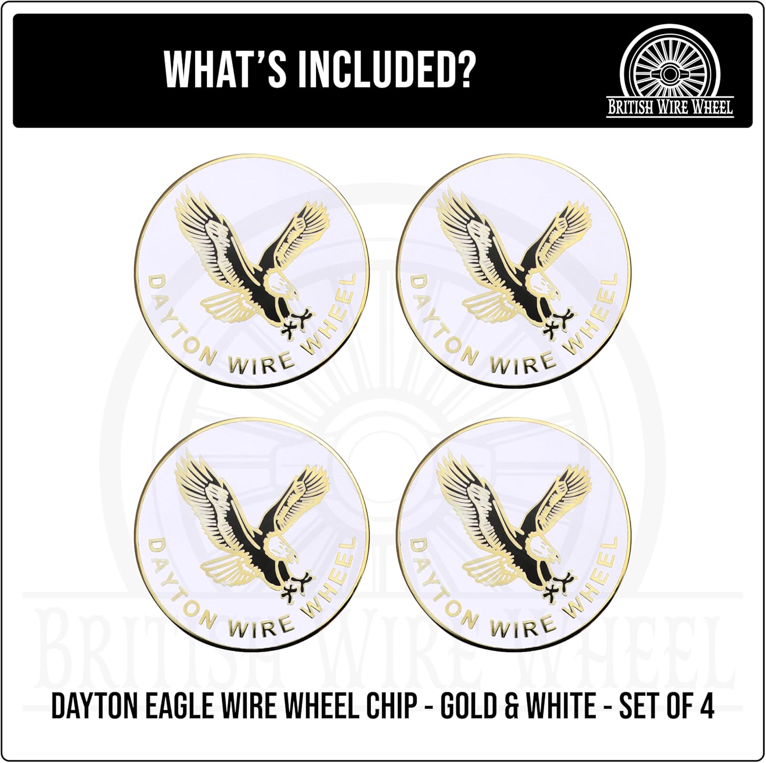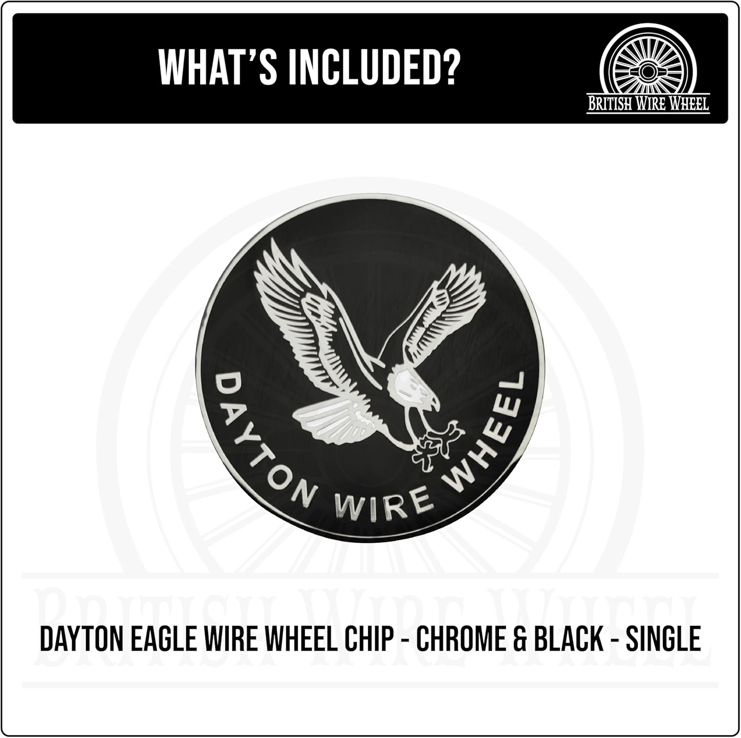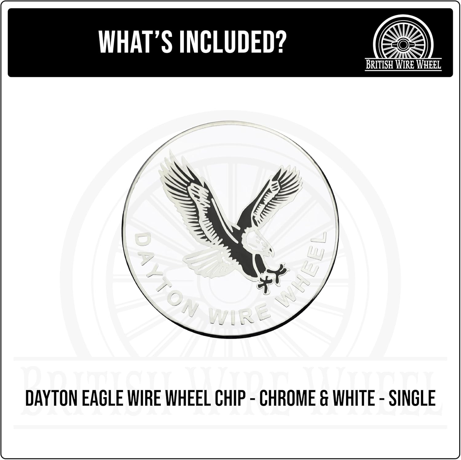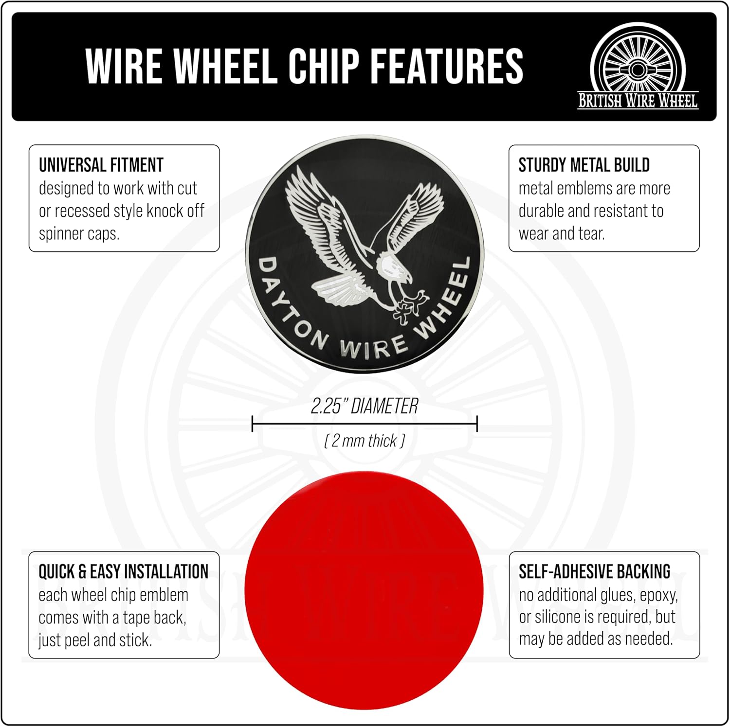 Introducing British Wire Wheel’s Dayton Eagle Chrome & White Wheel Chip emblems. They are constructed from solid metal with triple chrome plating and a high-grade enamel finish, providing a weather-proof, premium look. All chips come with a 3M sticker backing, making installation easy and secure.WHAT’S INCLUDEDYou will receive four (4) wire wheel chip emblems.COMPATIBILITYOur metal wire wheel chip emblems are 2.25” in diameter and 2 mm thick. They are universally compatible with cut/recessed styles of knockoff spinner caps, including those from Dayton Wire Wheel, Luxor, Truespoke, Razor, OG Wire, and other brands.EASY TO INSTALLInstalling these wire wheel chip emblems is hassle-free, thanks to the 3M adhesive backing that securely attaches to your knock-off spinner caps or any surface you prefer.Clean and dry the surface before application for the best results and secure installation. No additional glues, epoxy, or silicone adhesives are needed, but you can add them at your discretion and as needed.THE BRITISH WIRE WHEEL DIFFERENCE!Discover the British Wire Wheel difference: top-tier products, unmatched customer service, and an exclusive warranty for original purchasers. When you purchase from British Wire Wheel, you choose a respected family-run business with a strong commitment to delivering premium wire wheels and accessories at an accessible price point.