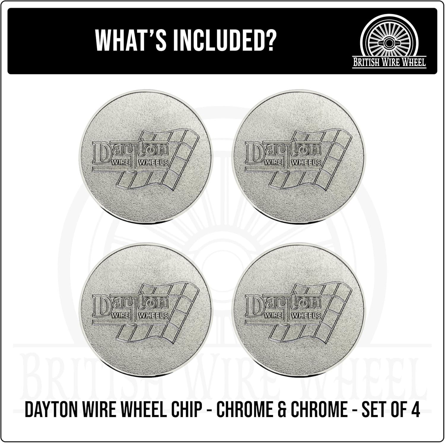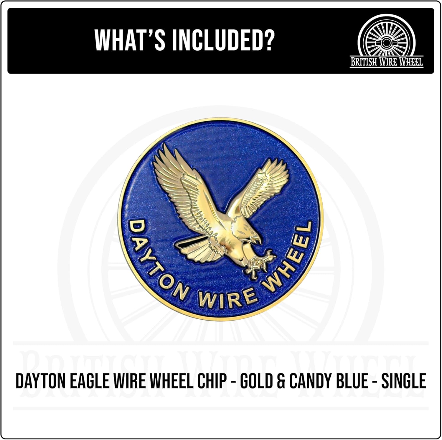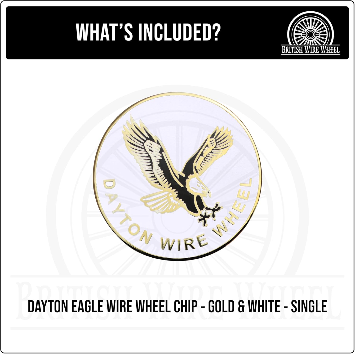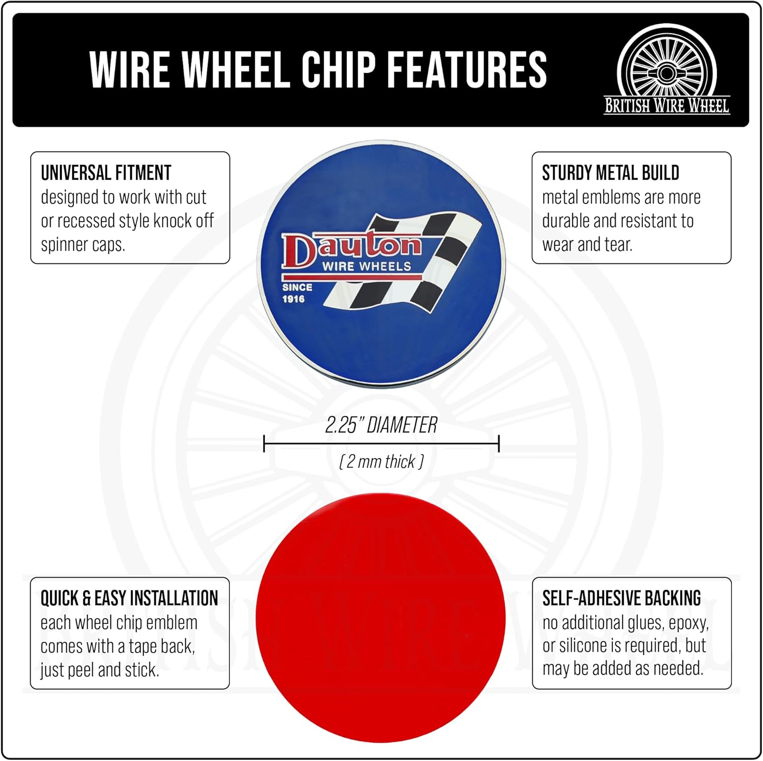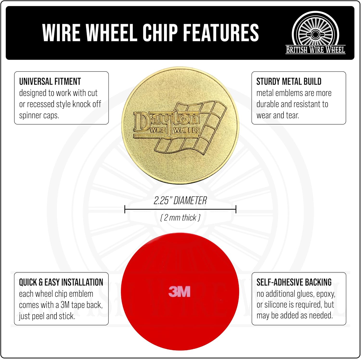Introducing British Wire Wheel’s Dayton Eagle Chrome & White Wheel Chip emblems. They are constructed from solid metal with triple chrome plating and a high-grade enamel finish, providing a weather-proof, premium look. All chips come with a 3M sticker backing, making installation easy and secure.WHAT’S INCLUDEDYou will receive four (4) wire wheel chip emblems.COMPATIBILITYOur metal wire wheel chip emblems are 2.25” in diameter and 2 mm thick. They are universally compatible with cut/recessed styles of knockoff spinner caps, including those from Dayton Wire Wheel, Luxor, Truespoke, Razor, OG Wire, and other brands.EASY TO INSTALLInstalling these wire wheel chip emblems is hassle-free, thanks to the 3M adhesive backing that securely attaches to your knock-off spinner caps or any surface you prefer.Clean and dry the surface before application for the best results and secure installation. No additional glues, epoxy, or silicone adhesives are needed, but you can add them at your discretion and as needed.THE BRITISH WIRE WHEEL DIFFERENCE!Discover the British Wire Wheel difference: top-tier products, unmatched customer service, and an exclusive warranty for original purchasers. When you purchase from British Wire Wheel, you choose a respected family-run business with a strong commitment to delivering premium wire wheels and accessories at an accessible price point.